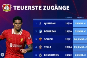 体育资讯7月3日讯 利物浦中卫宽萨已经官宣转会勒沃库森,《转会市场》统计显示他也是药厂队史标王。
