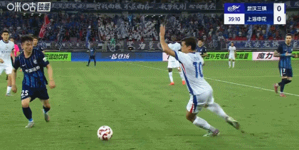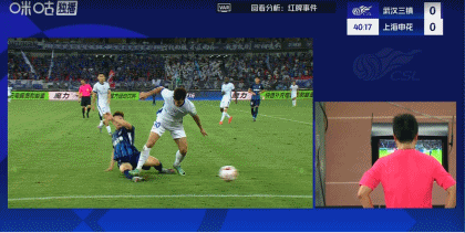 判例二:中超联赛第23轮,武汉三镇VS上海申花。比赛第40分钟,上海申花10号队员右脚踩到武汉队倒地队员腿部,裁判员未判罚犯规。VAR介入。裁判员经在场回看后,判上海申花10号犯规,并出示黄牌警告。