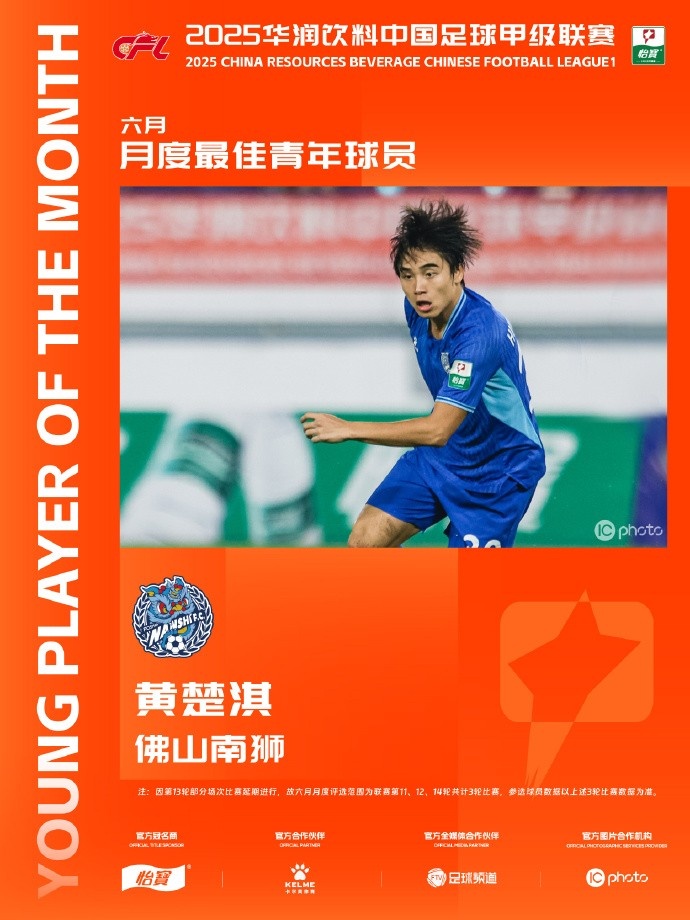 7月17日讯 中甲官方消息,佛山南狮边锋黄楚淇当选6月最佳青年球员。